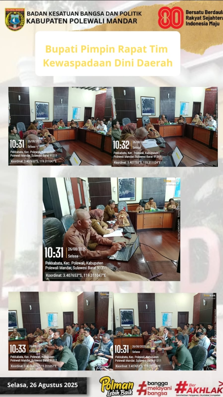 Polewali Mandar, pada Hari Selasa tanggal 26 Agustus 2025 Badan Kesatuan Bangsa dan Politik Kabupaten Polewali Mandar, Melaksanakan Rapat Tim Kewaspadaan Dini Daerah yang bertempat di ruang rapat Bupati Kegiatan ini di Pimpin langsung oleh Bupati Polewali Mandar Yamg di Hadiri oleh Wakil Bupati, Pj.Sekda, Kaban Kesbangpol, Pimpinan OPD terkait serta unsur Intelijen dari Kodim 1402 Polman, intelijen Polres, BINDA,Bais TNI dan Intelijen Kejaksaan serta unsur lainnya, kegiatan membahas isu-isu strategis yang berkembang dipolewali mandar serta terkait masalah pengelolaan sampah.(riz.admin)...