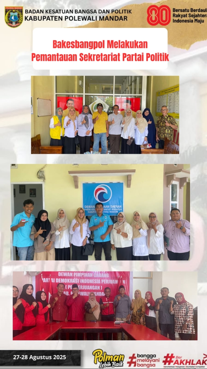 Polewali , Hari Rabu dan Kamis , 27-28 Agustus 2025 Badan Kesbangpol Kabupaten Polewali Mandar Melakukan Pemantauan Sekretariat Partai Politik dan Kelengkapan Administrasi Partai Politik Kepada Partai Golkar,Partai Gelora dan Partai PDIP , Kegiatan ini di Pimpin Langsung Kepala Bakesbangpol Hj.Asliah Rahim,S.Sos.,M.Si , bersama Sekretaris Badan Budiaty Bestari,S.Sos.,M.Si dan Jajaran Bidang Politik Dalam Negeri, Kegiatan ini dilakukan sebagai tugas dan fungsi memantau perkembangan politik dalam negeri termasuk penggunaan bantuan keuangan Partai Poltik dan administrasi partai secara umum (riz.admin)...
