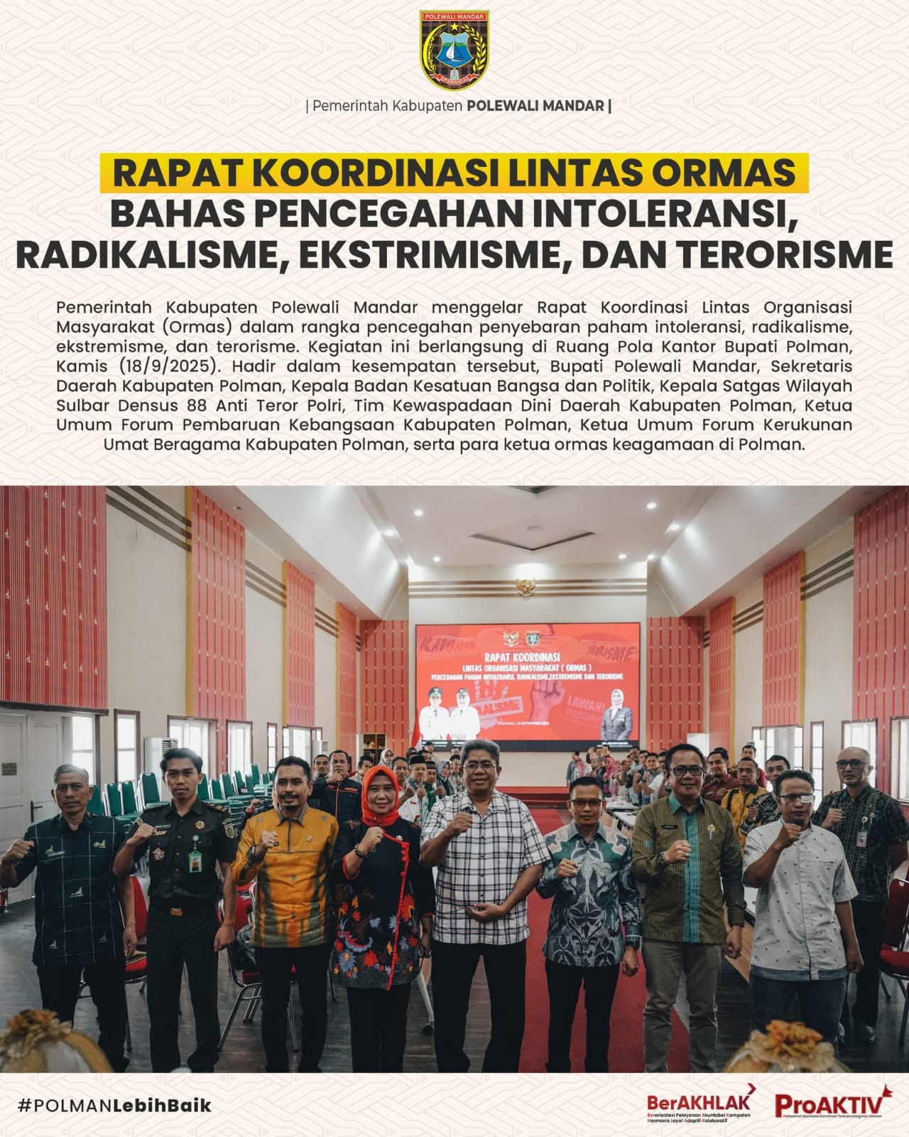 Polewali Mandar- Bupati Polewali Mandar, H. Samsul Mahmud, menegaskan pentingnya peran organisasi masyarakat (Ormas) sebagai garda terdepan dalam mencegah berkembangnya paham intoleransi, radikalisme, ekstremisme, dan terorisme. Hal ini disampaikan saat membuka Rapat Koordinasi Lintas Ormas yang digelar Badan Kesbangpol Polman di Ruang Pola Kantor Bupati, Kamis (18/9/2025).